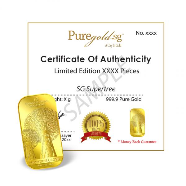 The image of the SuperTree Grove are embossed on a 1g 999.9 fine gold bar.