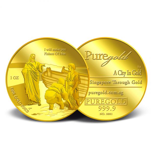 The "I Will Make You Fishers of Men" gold Medallion design portrays an image of Jesus and the two brothers, Peter and Andrew at Sea of Galilee by a boat. The design also includes the inscription”I Will Make You Fishers of Men", the Medallion’s weight and fineness.