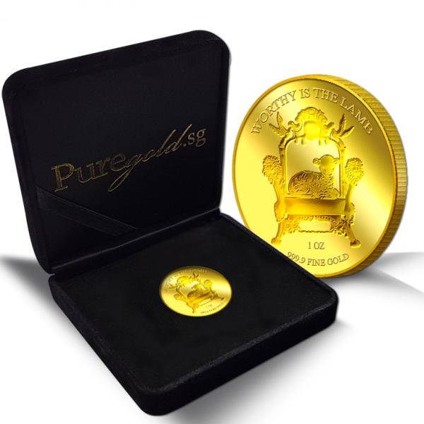 The images of "Worthy is the Lamb" are embossed on a 1oz 999.9 fine gold Medallion.