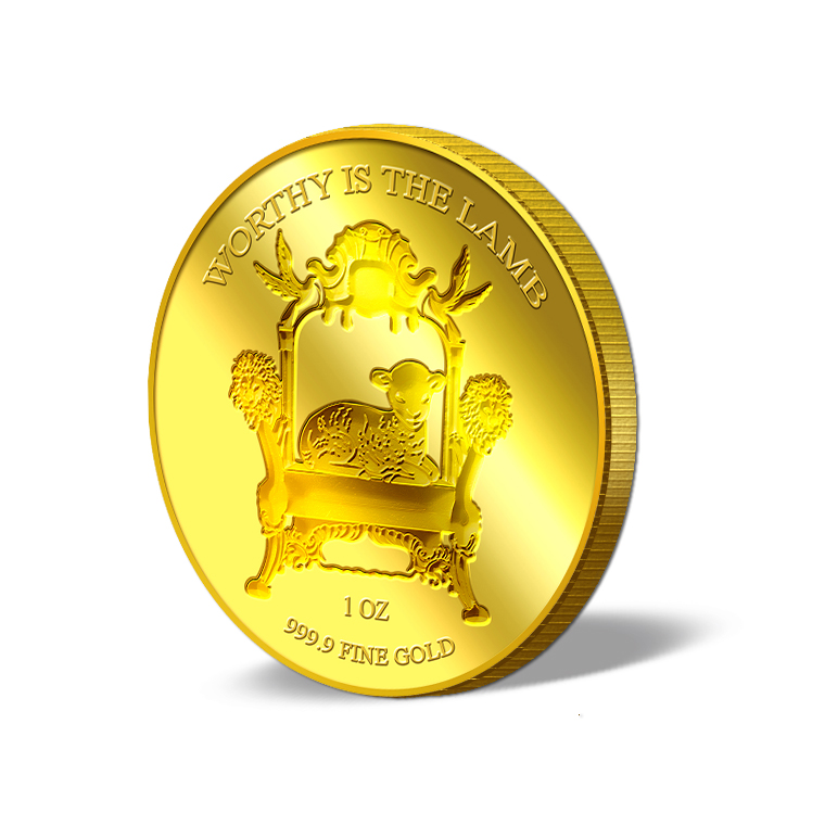 The "Worthy is the Lamb" gold Medallion design portrays an image of a lamb on a throne. The design also includes the inscription “Worthy is the Lamb", the Medallion’s weight and fineness.