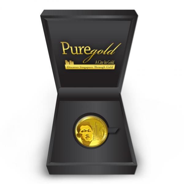 The 'Our Founding Father' gold Medallion design portrays an image of our Founding Father with outline of buildings as the background. The design also includes the inscription “OUR FOUNDING FATHER" and the Medallion’s weight.
