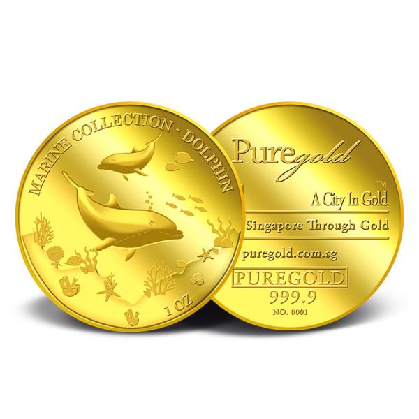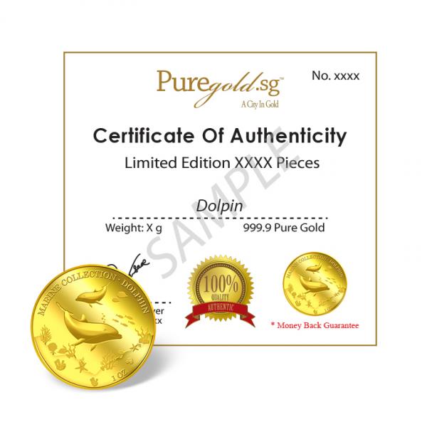 The image of the two dolphins is embossed on a 1oz 999.9 fine gold Medallion.