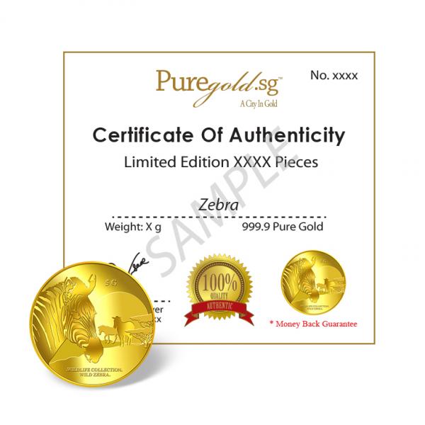The image of a zebra is embossed on a 5g 999.9 fine gold.