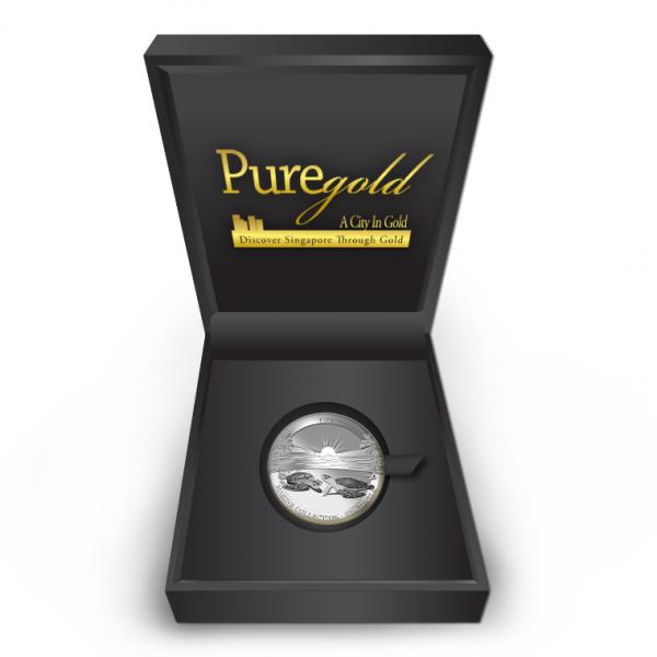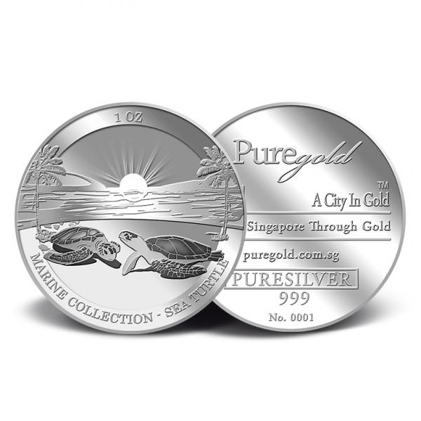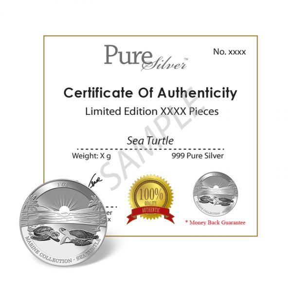 The image of the two sea turtles is embossed on a 1Oz 999 fine silver medallion.
