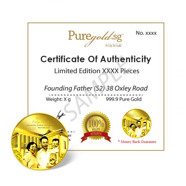 The image of Founding Father with his wife and son, and their house at 38 Oxley Road is embossed on a 1oz 999.9 fine gold Medallion.