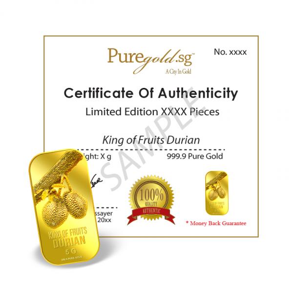 The image of the durian is embossed on a 5g 999.9 fine gold bar.