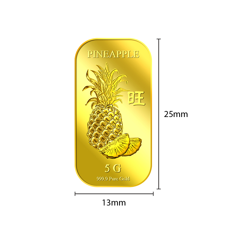 The image of the pineapple is embossed on a 5g 999.9 fine gold bar.