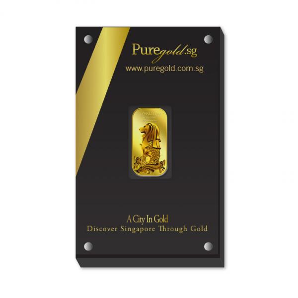 The image of the Singapore Merlion is embossed on a 10g 999.9 fine gold bar.