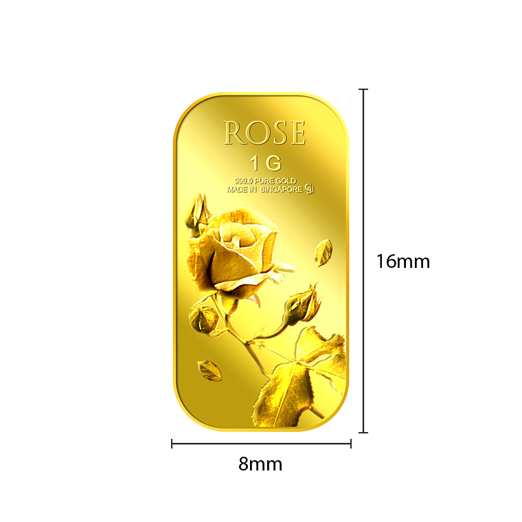 The image of the Rose is embossed on a 1g 999.9 fine gold bar.