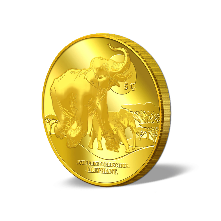 The Elephant gold Medallion design portrays an image of an Elephant. The design also includes the inscription WILDLIFE COLLECTION, ELEPHANT, the Medallion’s weight and fineness.