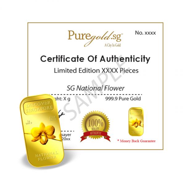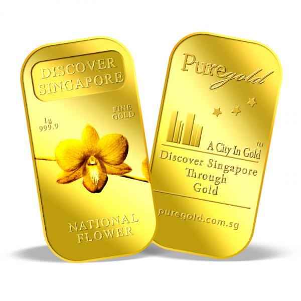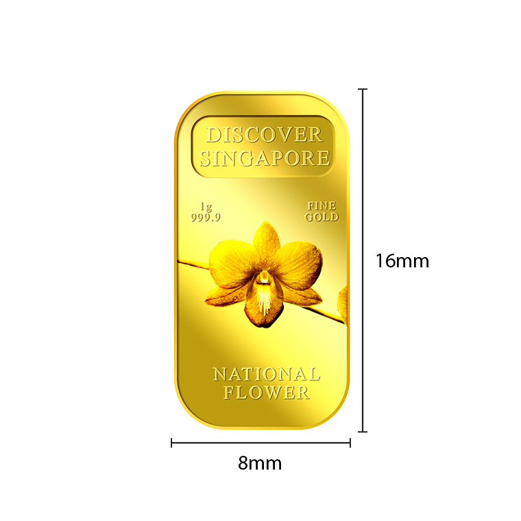 The image of Singapore’s national flower, Vanda Miss Joaquim Orchid, is embossed on a 1g 999.9 fine gold bar.