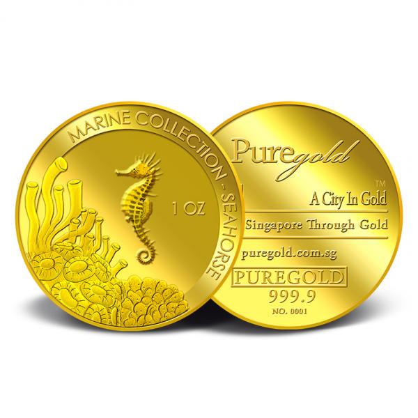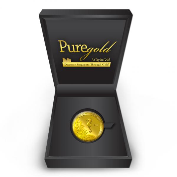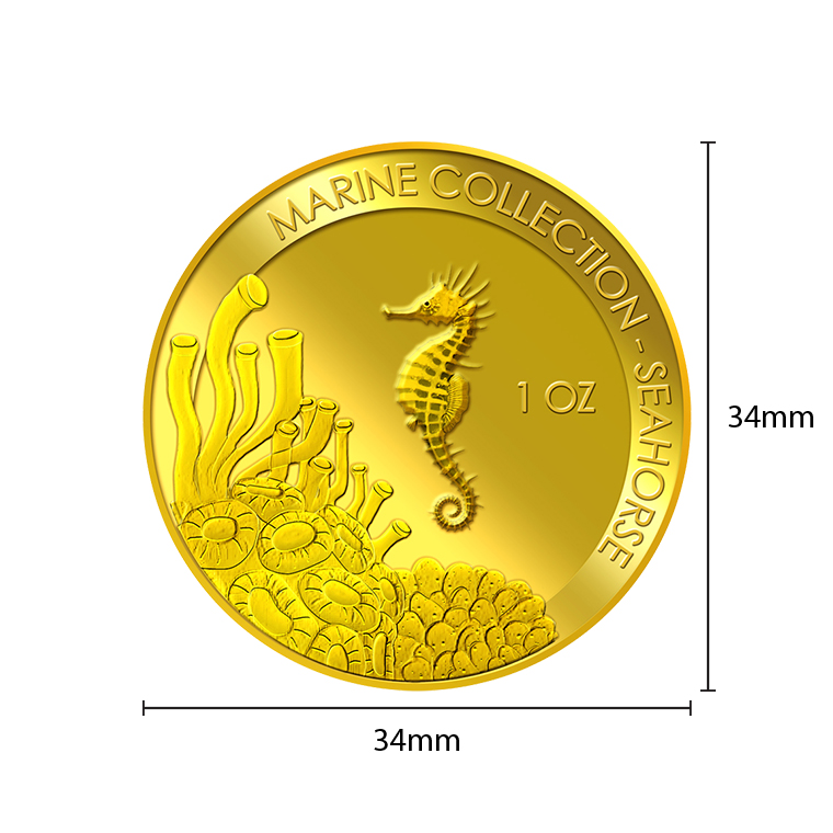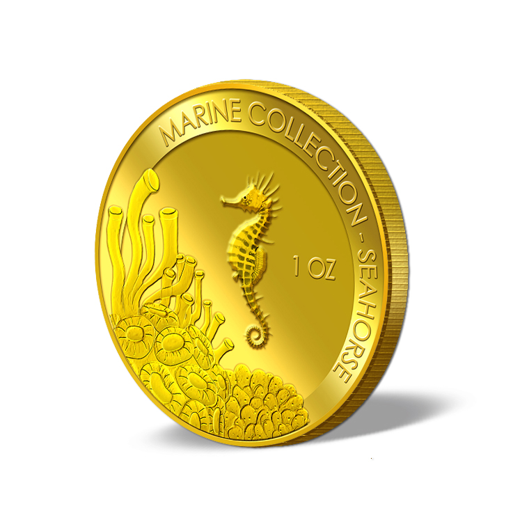 The image of the Seahorse is embossed on a 1oz 999.9 fine gold Medallion.