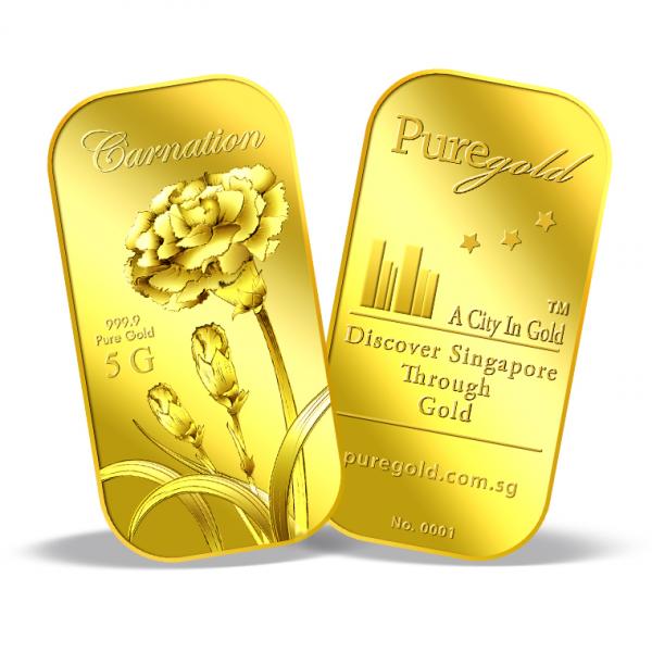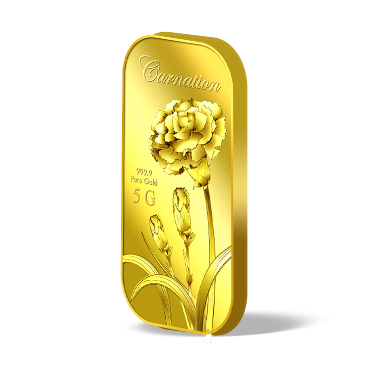 The image of the Carnation is embossed on a 5g 999.9 fine gold bar.