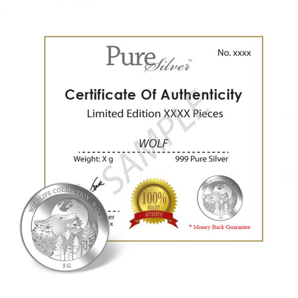 The image of a Wolf is embossed on a 5g 999 fine silver.
