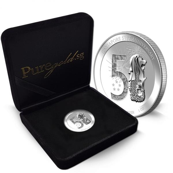 The 1Oz 51st Anniversary Silver Medallion design portrays an image of the 51st year. The design also includes the inscription SINGAPORE 51ST ANNIVERSARY, the medallion’s weight and fineness, and GoldSilver Refinery’s “GS” logo mark.
