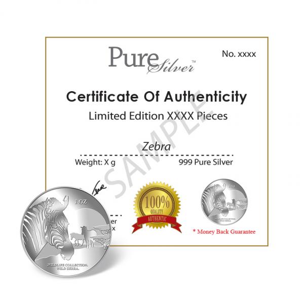 The image of a zebra is embossed on a 1Oz 999 fine silver.