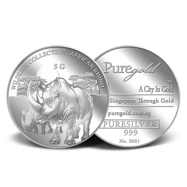 The image of a Rhinoceros is embossed on a 5g 999 fine silver.