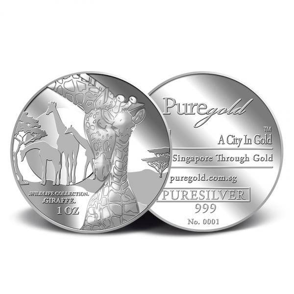 The image of a giraffe and its calf is embossed on a 1Oz 999 fine silver.