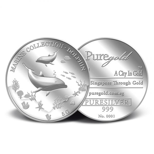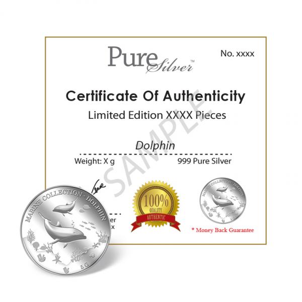The image of the two dolphins is embossed on a 5g 999 fine silver medallion.