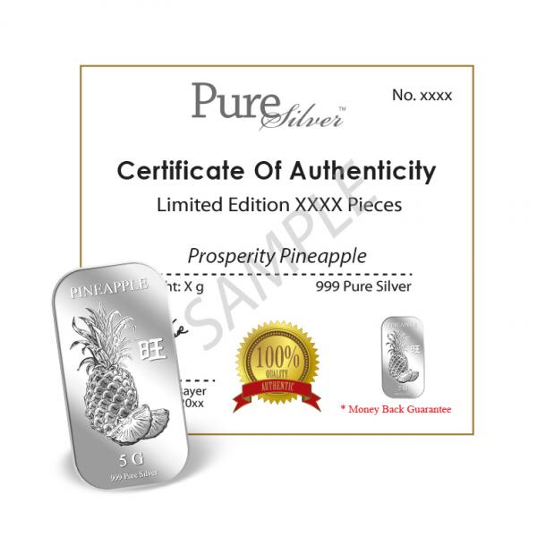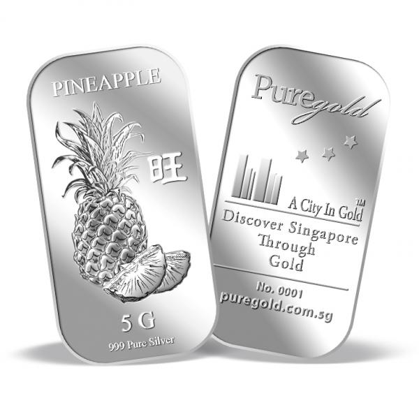 The image of the pineapple is embossed on a 5g 999 fine silver bar.