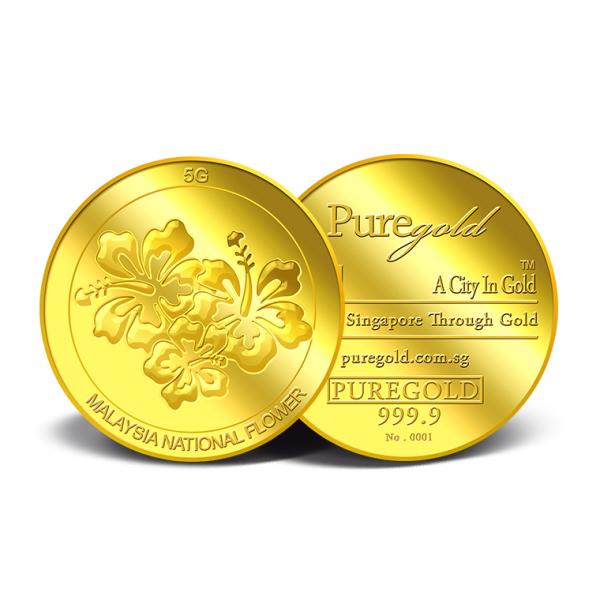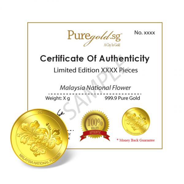 The image of the Hibiscus is embossed on a 5g 999.9 fine gold Medallion.