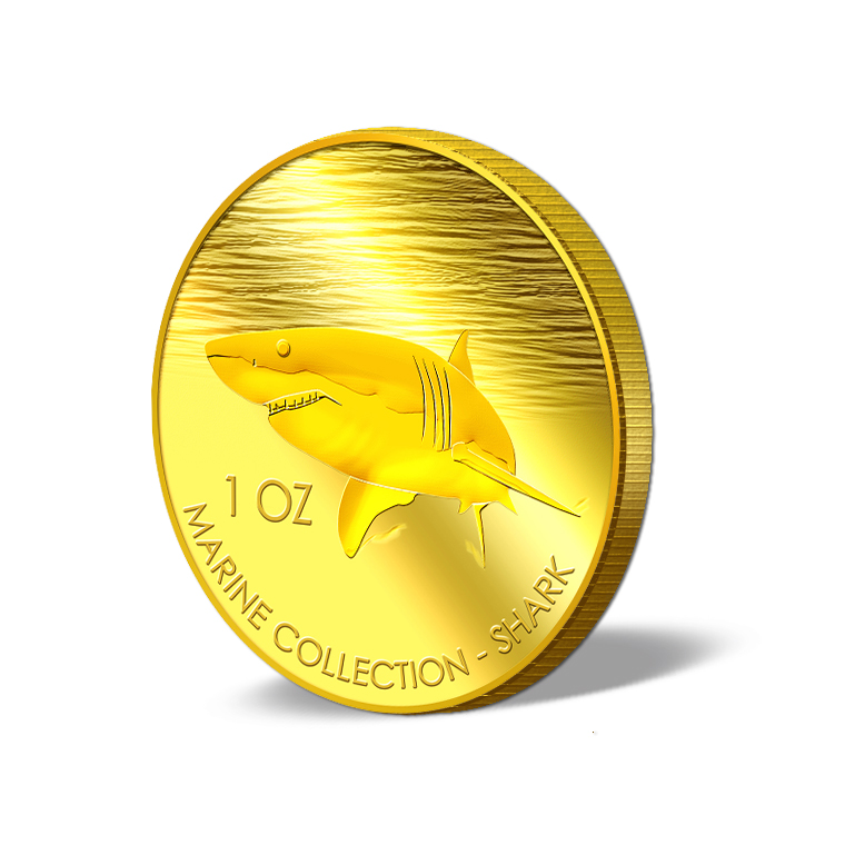 The image of the Shark is embossed on a 1oz 999.9 fine gold Medallion.