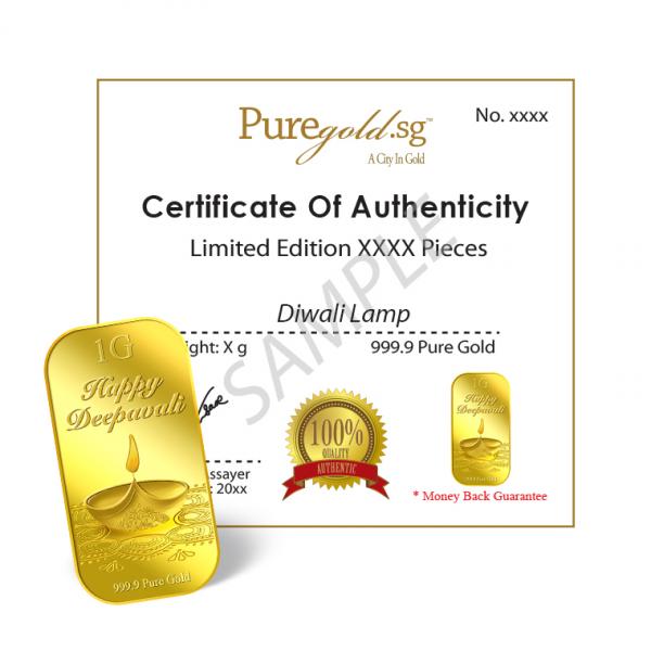 The image of Lamp is embossed on a 1g 999.9 fine gold Bar.