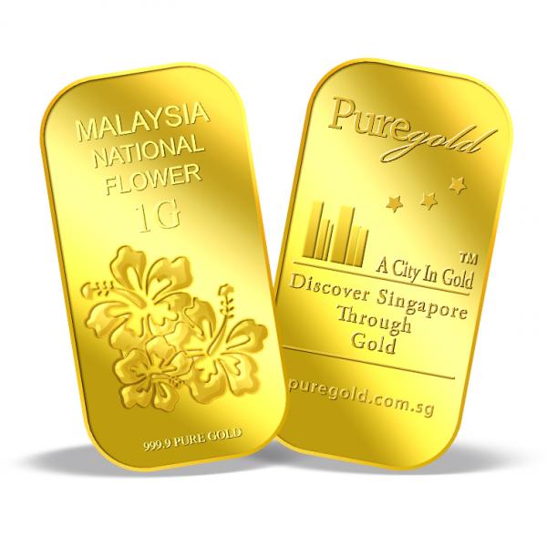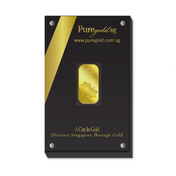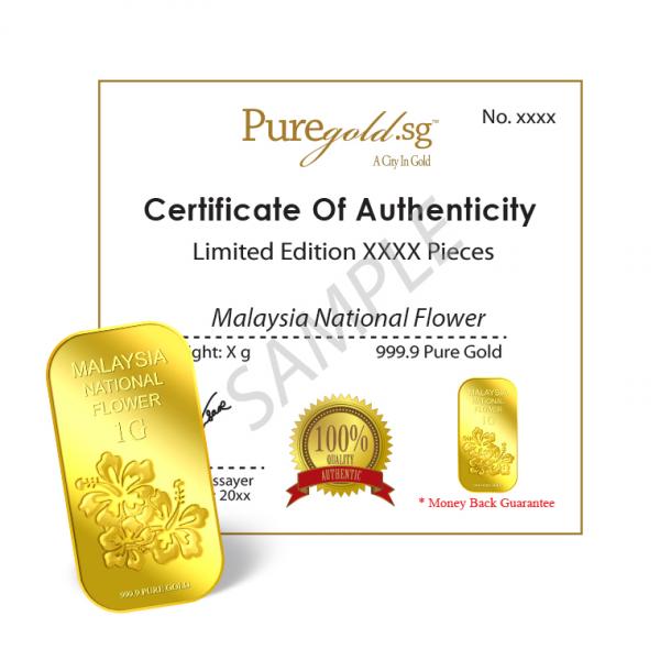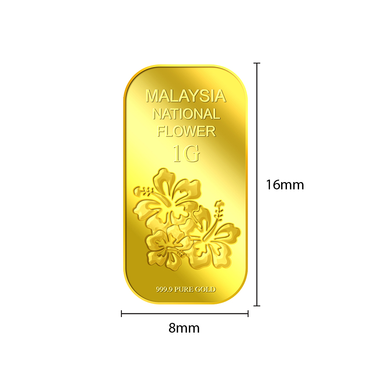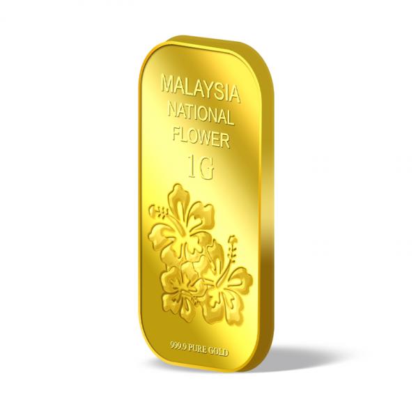 The image of the Hibiscus is embossed on a 1g 999.9 fine gold bar.