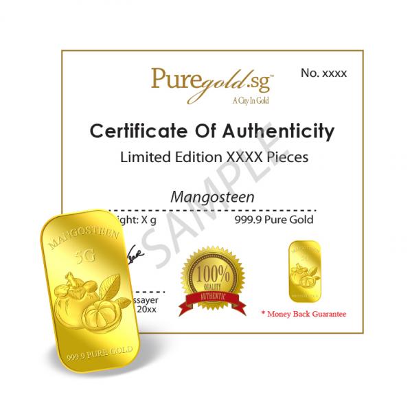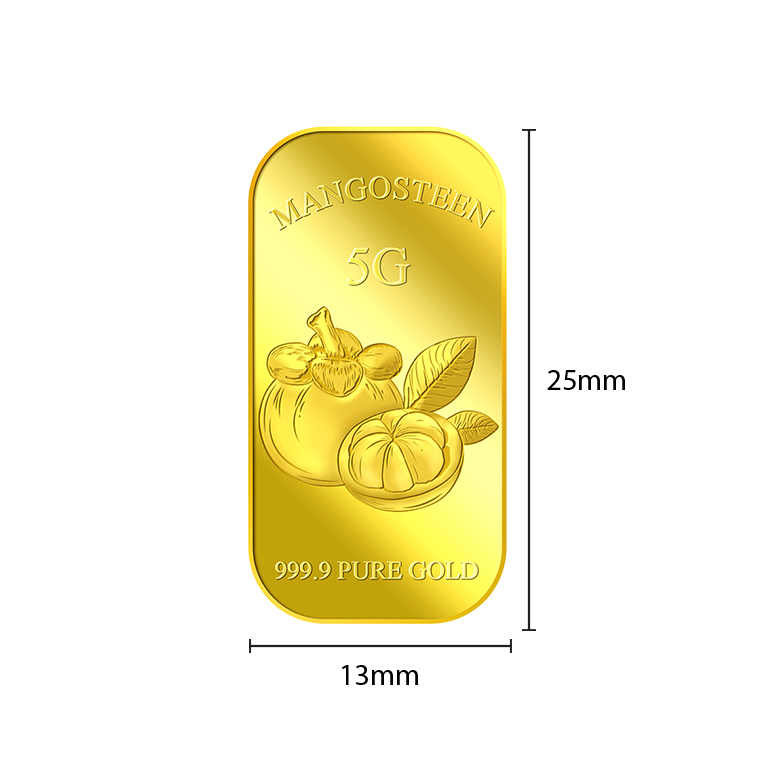 The image of the mangosteen is embossed on a 5g 999.9 fine gold bar.