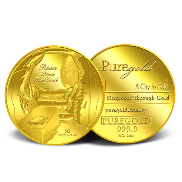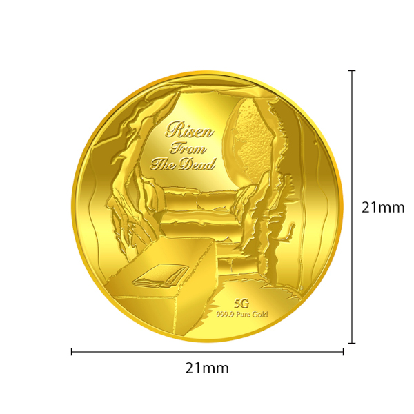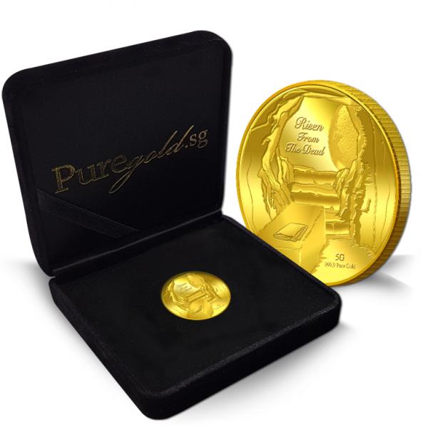 The images of Risen from the Dead are embossed on a 5g 999.9 fine gold Medallion.