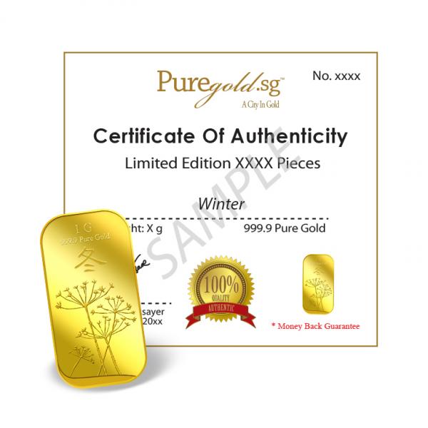 The image is embossed on a 1g 999.9 fine gold bar.