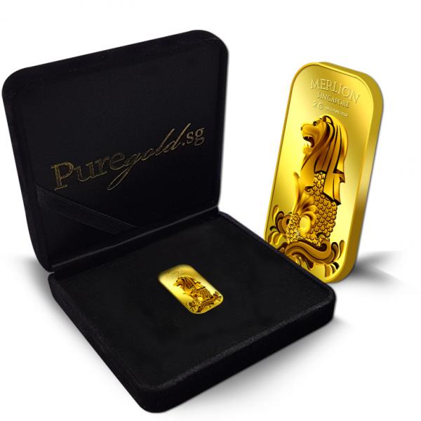 The image of the Singapore Merlion is embossed on a 2g 999.9 fine gold bar.