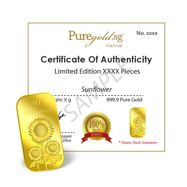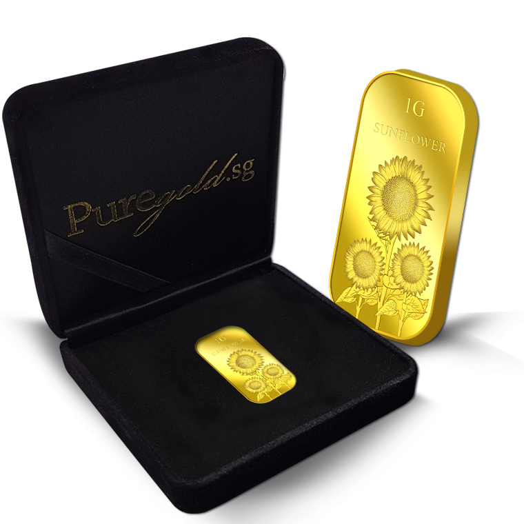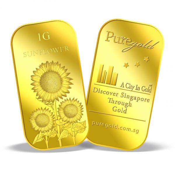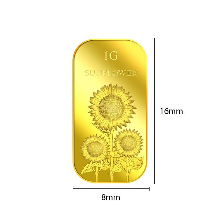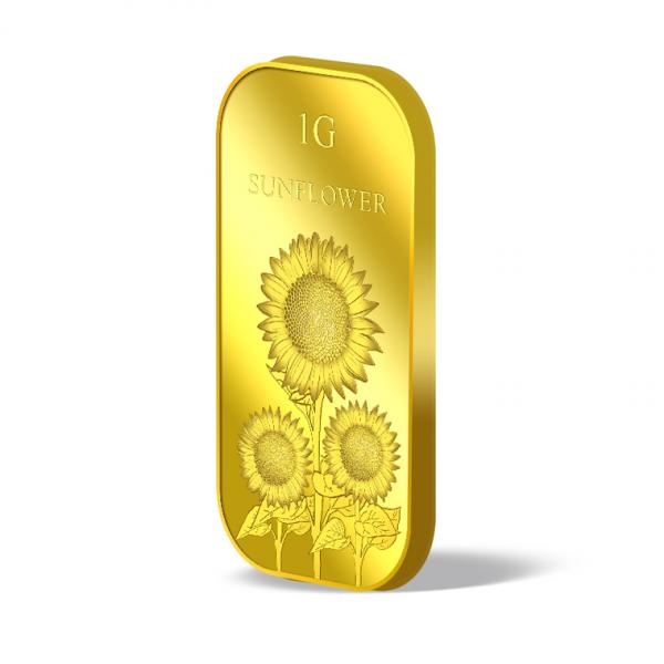 The image of the Sunflower is embossed on a 1g 999.9 fine gold bar.