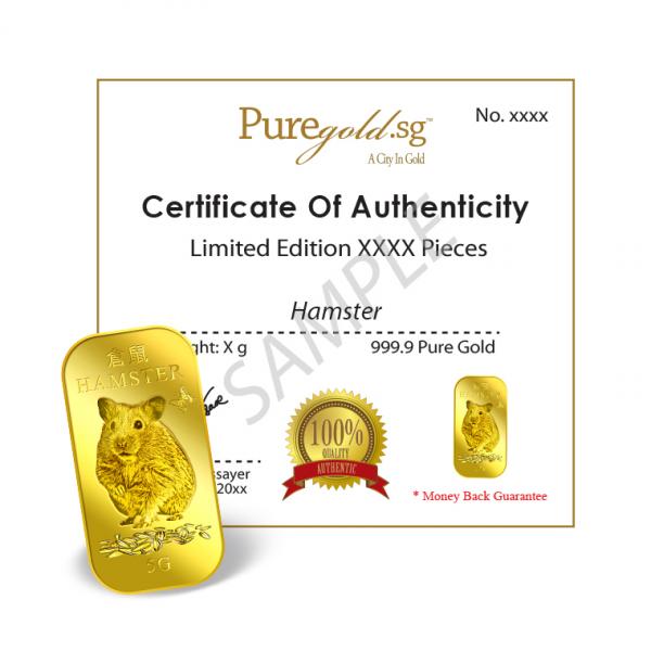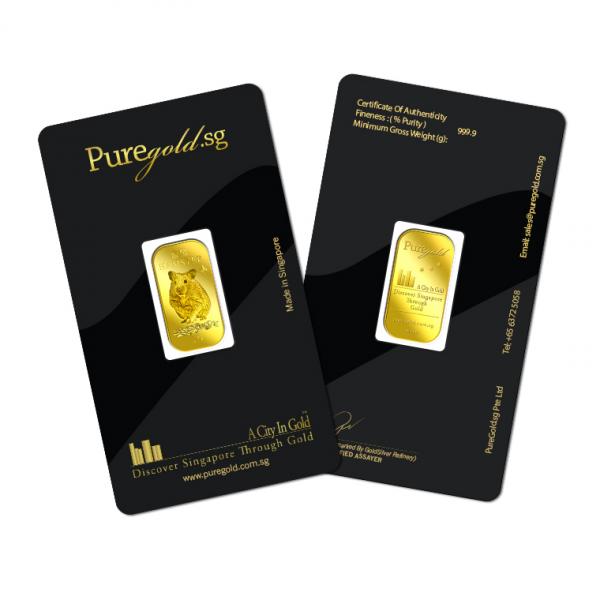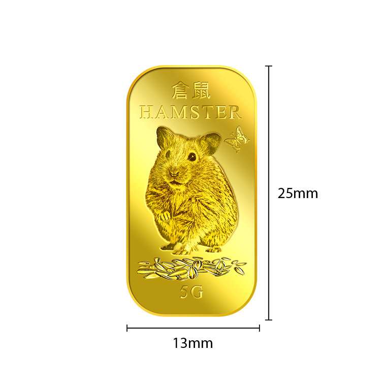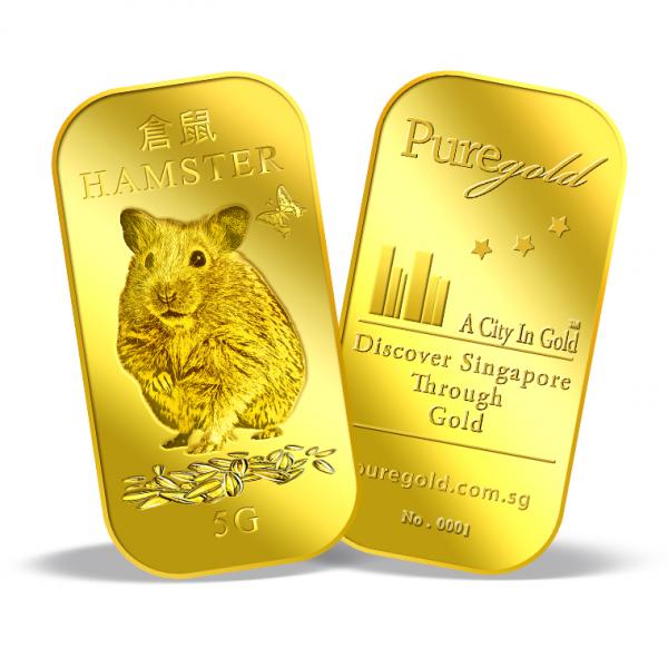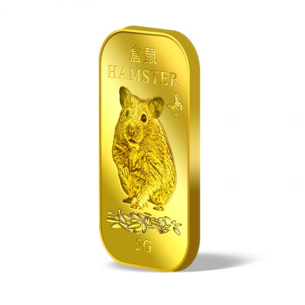 The image is embossed on a 5 grams 999.9 fine gold bar.