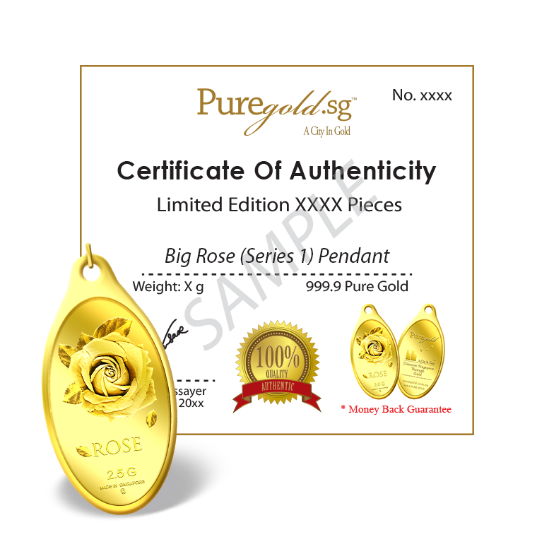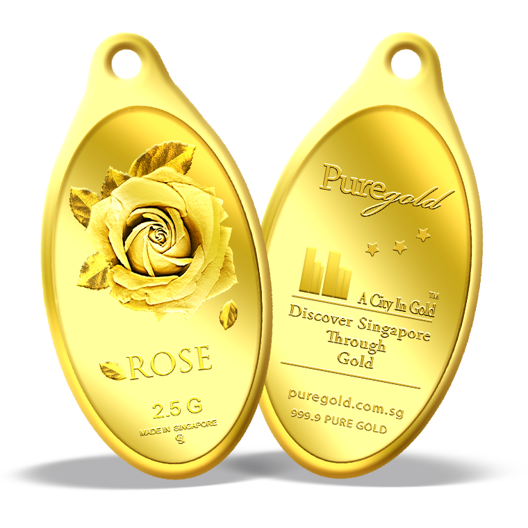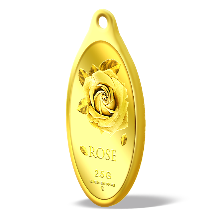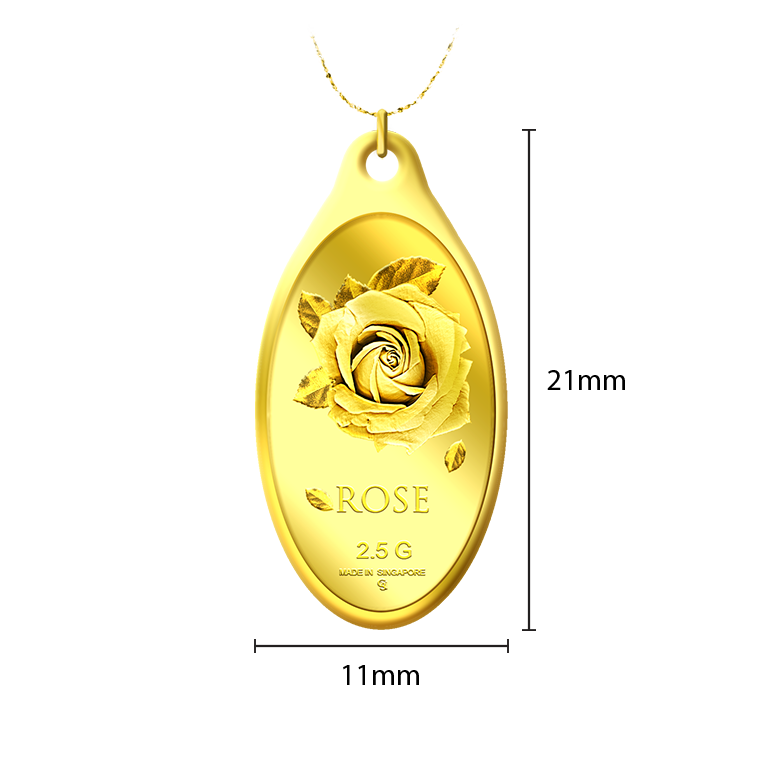 In this uniquely designed gold pendant, the big single gold rose with leaves represents joy, gladness, friendship and hope, making this gold bar a perfect gift for loved ones or close friends to show them that we rejoice in their happiness.