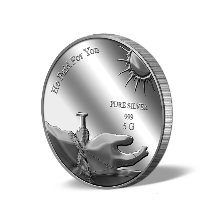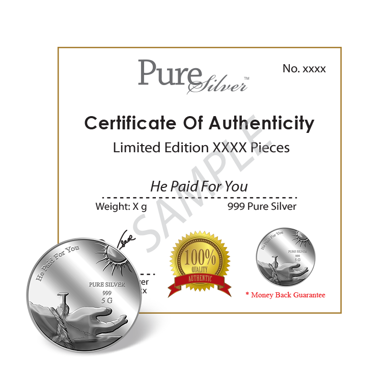 The "He Paid For You" silver medallion design portrays an image of Jesus' hand fastened to the wooden cross, and the rising sun which refers to the coming of the Lord Jesus Christ in power and great glory. The design also includes the inscription “He Paid For You", the medallion’s weight and fineness.