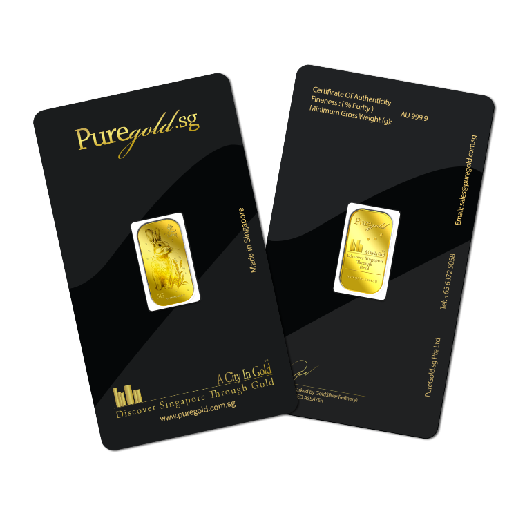 The image is embossed on a 5 grams 999.9 fine gold bar.
