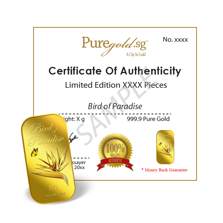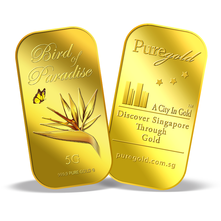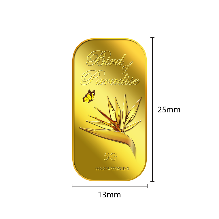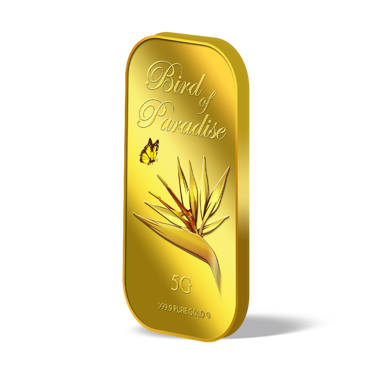 The image is embossed on a 5 grams 999.9 fine gold bar.