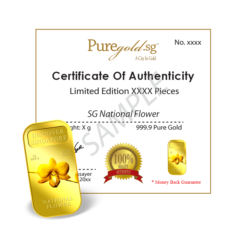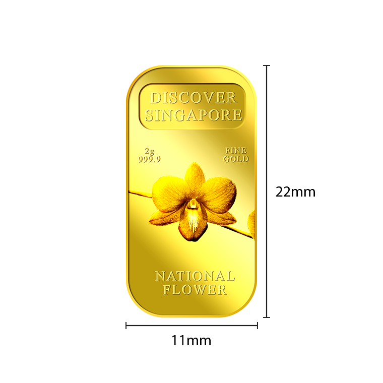 The image of Singapore’s national flower, Vanda Miss Joaquim Orchid, is embossed on a 5g 999.9 fine gold bar.