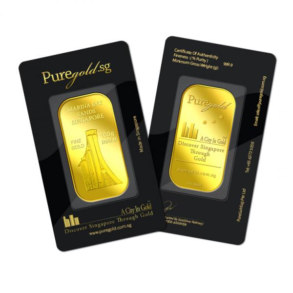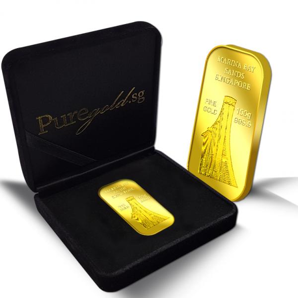 The images of Marina Bay Sands Singapore are embossed on a 100g 999.9 fine gold bar.
