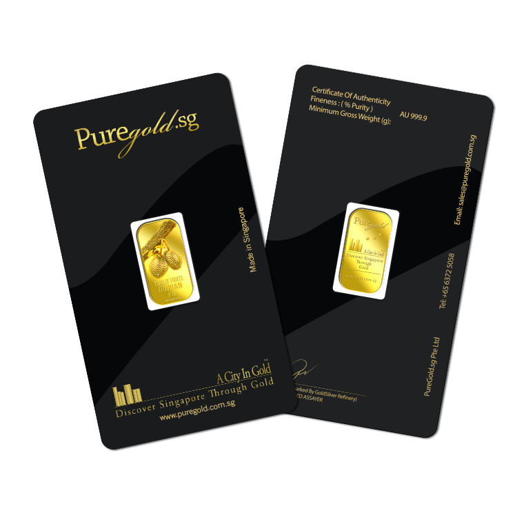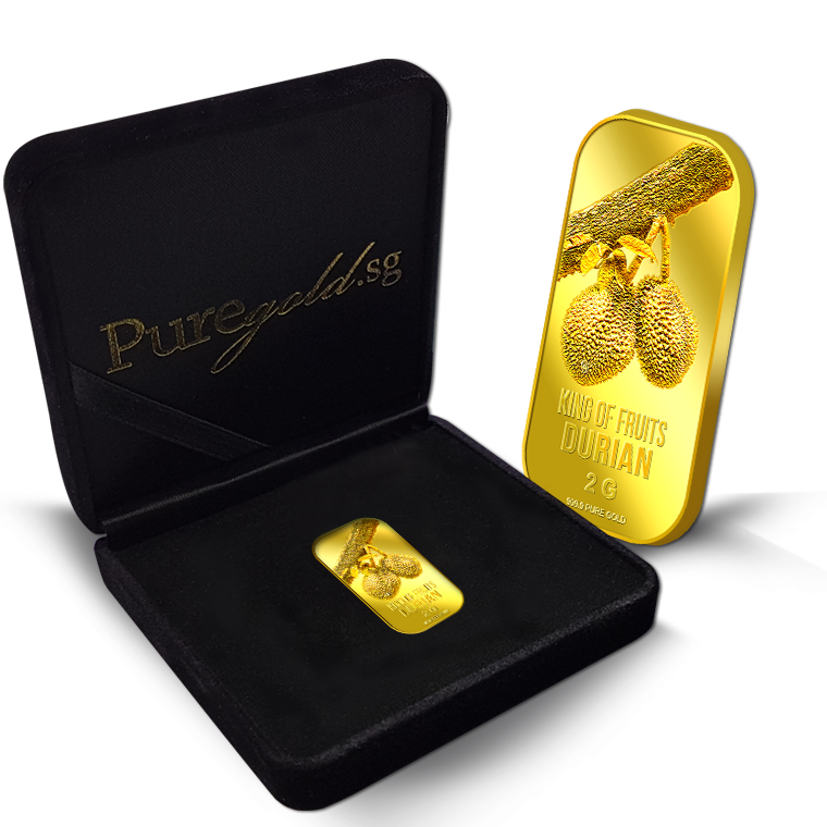 The image is embossed on a 2 grams 999.9 fine gold bar.