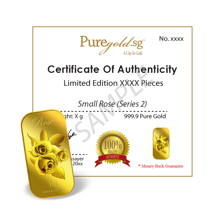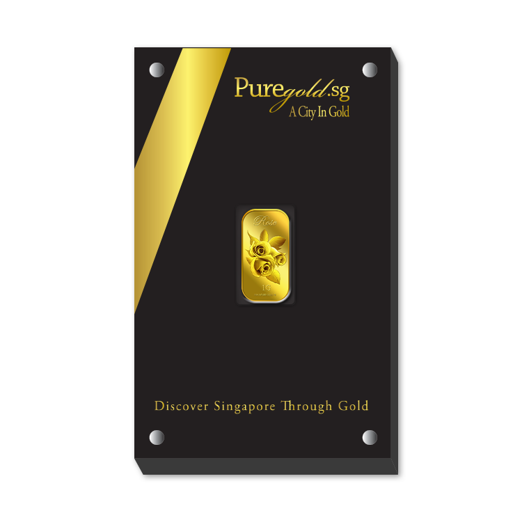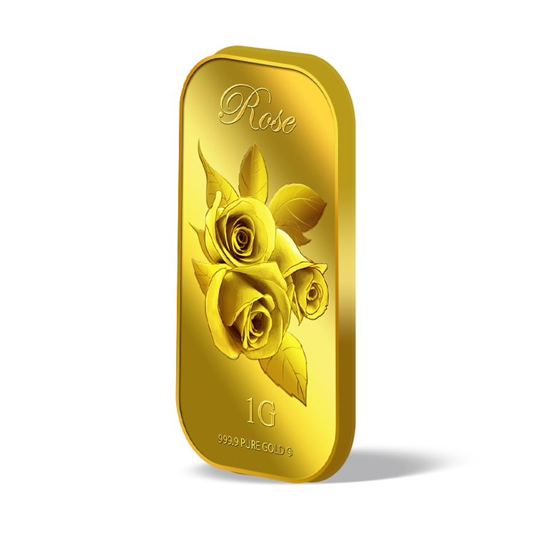 In this uniquely designed gold bar, the big single gold rose with leaves represents joy, gladness, friendship and hope, making this gold bar a perfect gift for loved ones or close friends to show them that we rejoice in their happiness.