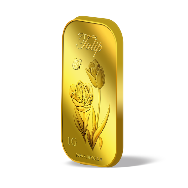 The image is embossed on a 1 gram 999.9 fine gold bar.
