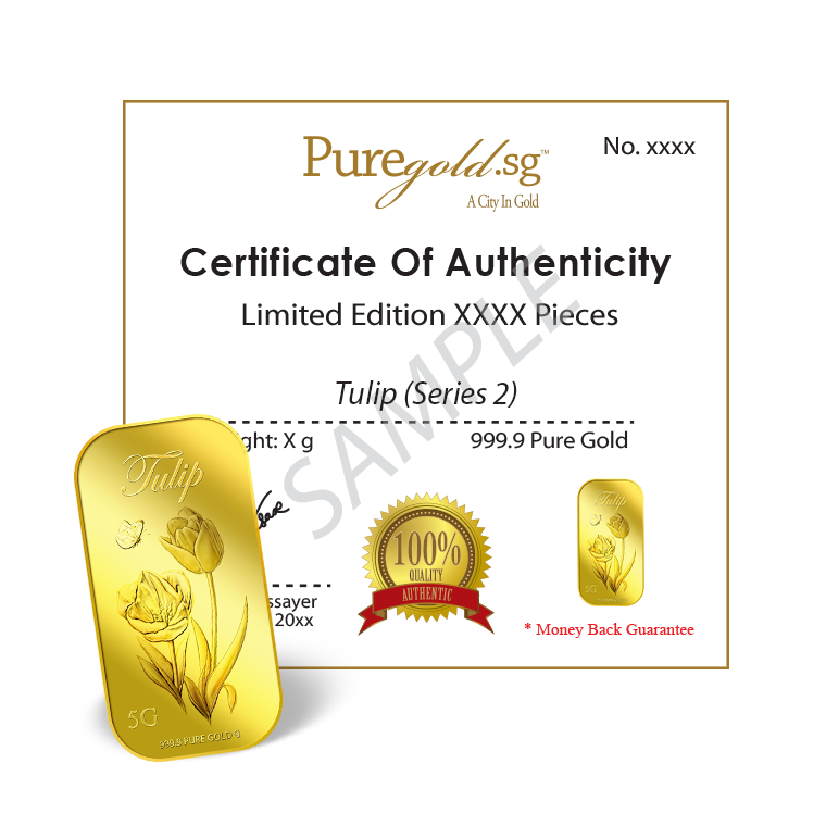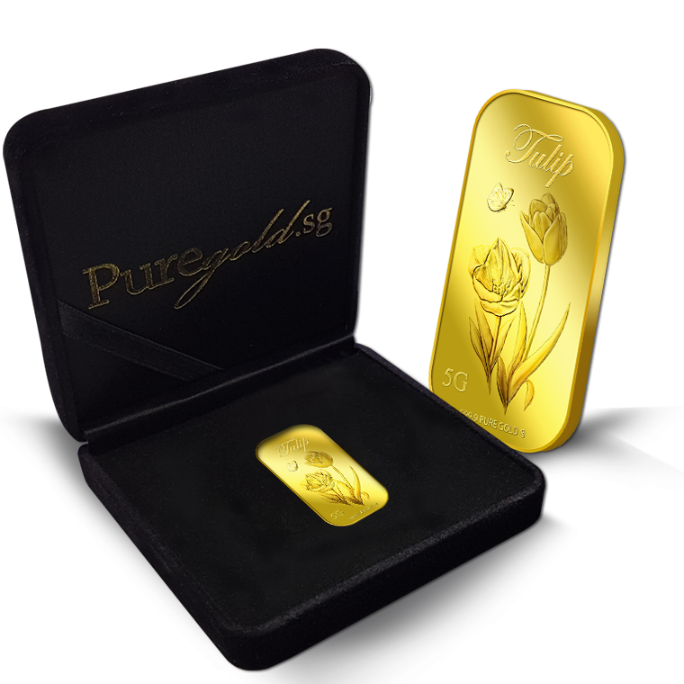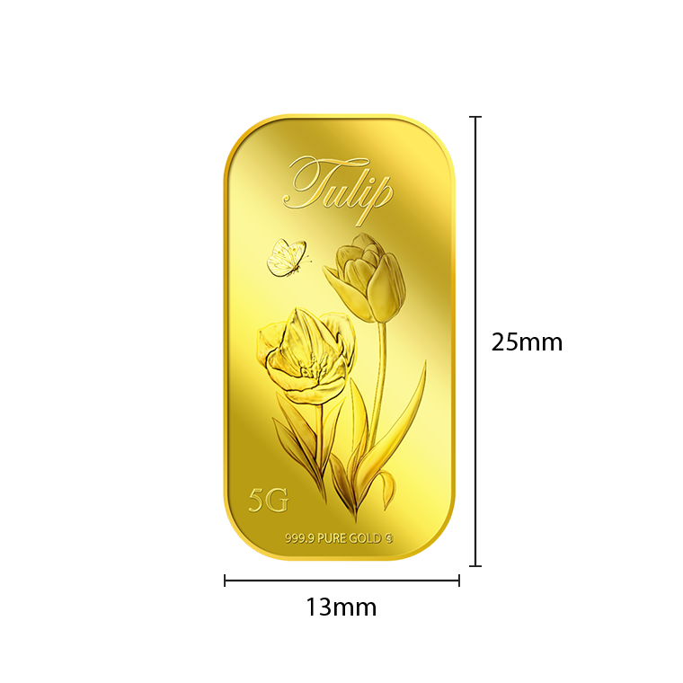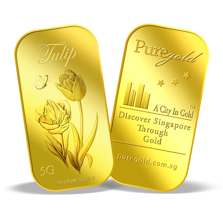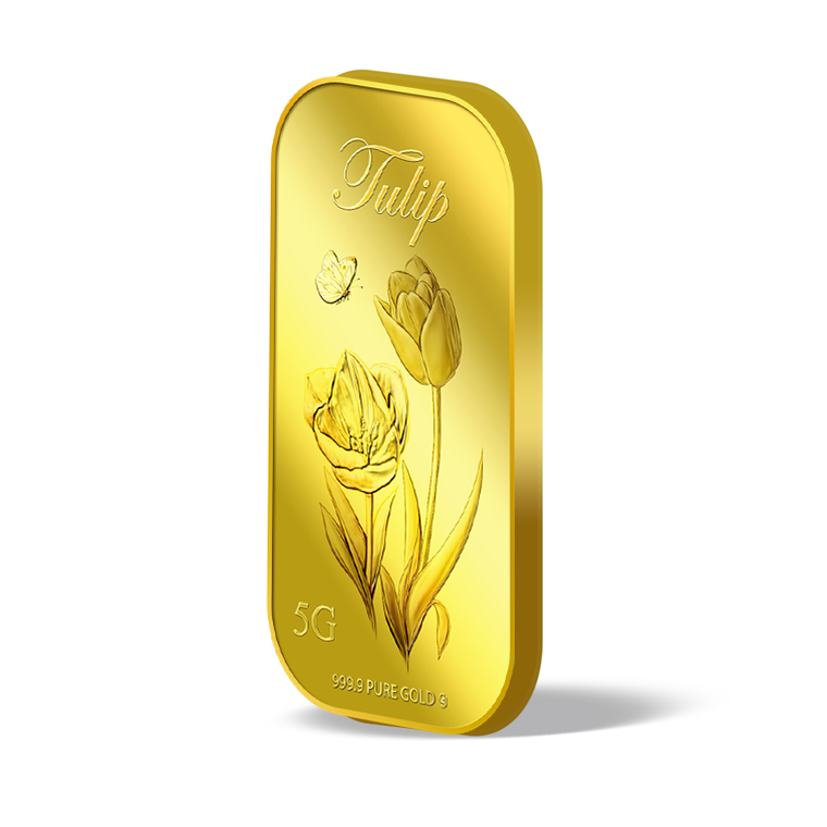The image is embossed on a 5 grams 999.9 fine gold bar.