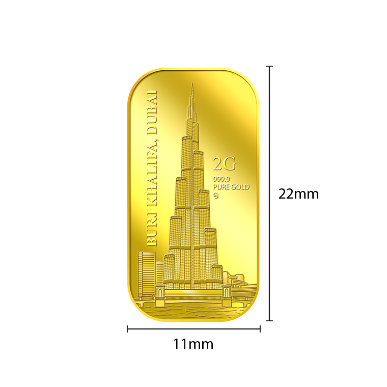 The image is embossed on a 2 grams 999.9 fine gold bar.