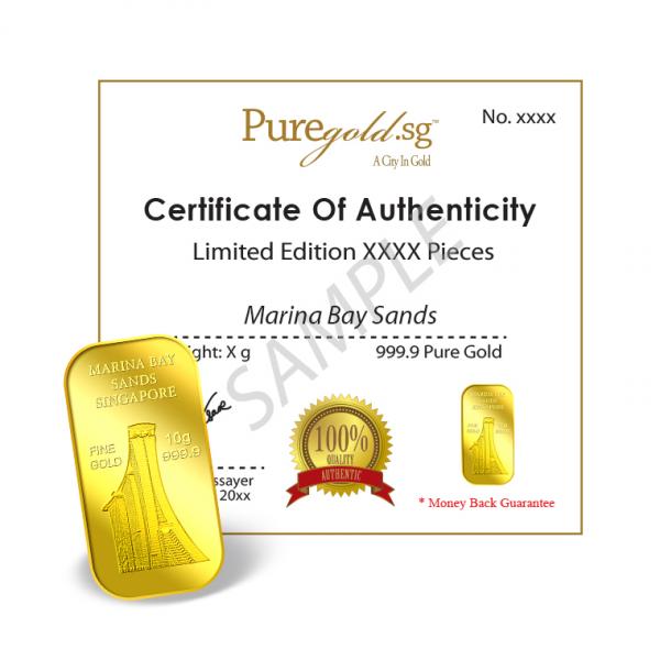 The image of Marina Bay Sands is embossed on a 10g 999.9 fine gold bar.
